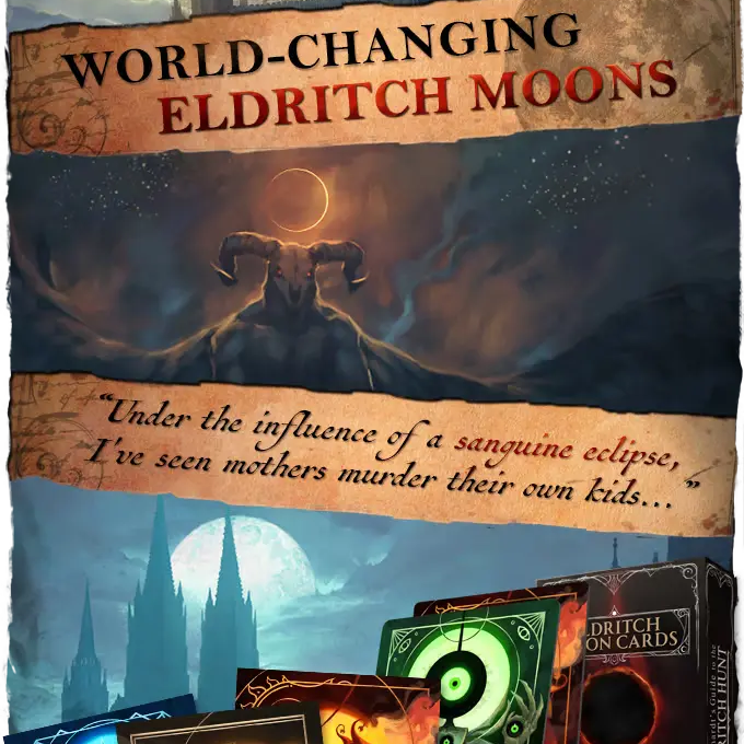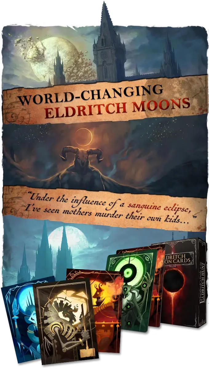- Full Art Bundle: High-resolution monster illustrations, Eldritch Moon tarot cards, character art, sketches, and printable field notes to give to players on the hunt.